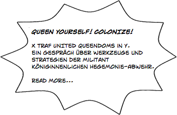 QUEENZINE 08 GRANDE FINALE!october 2012. mit starschnitt.´So many lots!´ ´So many landladies!´ The landscape QUEENZINE 08 is sprawling. ´It is out of control!´ ´Stop this senseless holiday now!´ ´QUEENZINE 08 GRANDE FINALE IST EINE MÜTTERMÖRDERIN´ ´Utopia´s and Dystopia´s gowns don’t fit anymore!´ ---- RELEASE! |